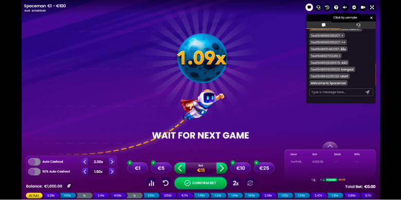 Drücken Sie auf "Bestätigen" und warten Sie, bis die Runde beginnt. Der höchste Gewinn ist das 5.000-fache des Einsatzes. Es gibt keine Auszahlungstabelle; die Gewinne hängen von der Länge des Weges ab, den ein Kosmonaut fliegt.