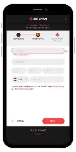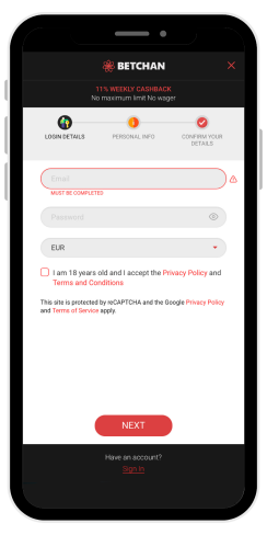 Sie müssen Ihre E-Mail-Adresse (BetChan-Casino-Login) und Ihr Passwort eingeben und eine Währung wählen. Sie müssen auch das Kästchen ankreuzen, mit dem Sie bestätigen, dass Sie mindestens 18 Jahre alt sind und dass Sie die Datenschutzbestimmungen und die Allgemeinen Geschäftsbedingungen akzeptieren.