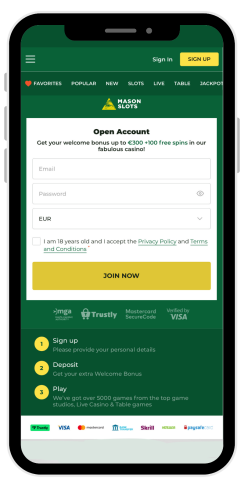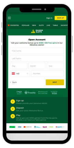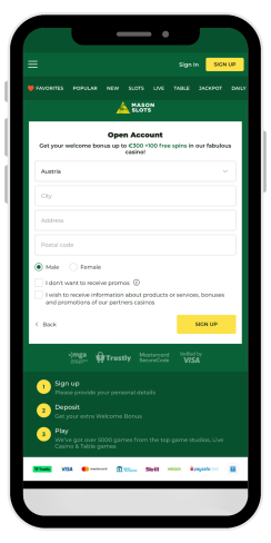 Die Registrierung auf der Website ist schnell und einfach. Ich habe nur ein paar Minuten dafür gebraucht. Sie müssen in mehreren Schritten Informationen für Ihr Mason Slots-Casino-Login und zur späteren Überprüfung eingeben.
