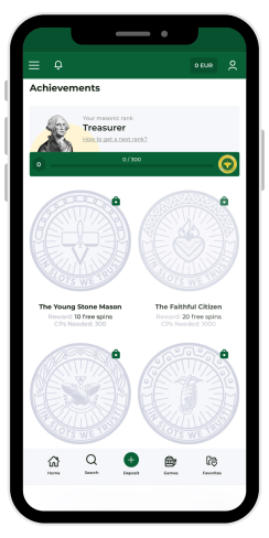 Das VIP-Programm des Mason Slots-Casinos ist in 20 Errungenschaften unterteilt. Bei Erreichen eines jeden Levels erhält der Spieler Belohnungen in Form von Freispielen und Bonusgeld. Auf der höchsten Stufe (Stufe 20) ist die Belohnung eine Reise zu Freimaurerorten. Um Errungenschaften freizuschalten, müssen die Spieler Comp Points sammeln. Sie können 1 CP pro €1 Einsatz erhalten. Um zum Beispiel die erste Errungenschaft, "Der junge Steinmetz", freizuschalten, müssen Sie 300 CP sammeln, was €300 an Wetten bedeutet. Meiner Meinung nach hat das Casino ein transparentes und faires VIP-Programm im Vergleich zu anderen Seiten.