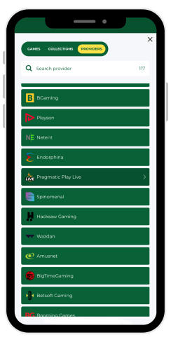 Die Spieler haben Zugang zu einer großen Auswahl an MasonSlots Casinospielen von 117 Anbietern. Einige von ihnen haben territoriale Beschränkungen. Sie können überprüfen, welche Spiele in Ihrem Land verfügbar sind hier.