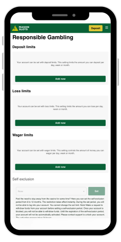 Eine große Auswahl an verantwortungsbewussten Spieltools - Mason Slots Casino bietet ein umfangreiches Set an Limits und Selbstkontrollfunktionen, was zeigt, dass das Casino der Sicherheit der Spieler und einem verantwortungsbewussten Verhalten wirklich Priorität einräumt.