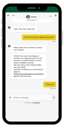 Während der Vorbereitung dieses Mason Slots Testberichts habe ich festgestellt, dass der schnellste Weg, eine Antwort vom Support zu erhalten, der Live Chat ist. Ein Agent verbindet sich sofort und antwortet sehr schnell. Sie können auch Deutsch als Kommunikationssprache wählen. Meiner Meinung nach ist dies sehr gut für ein internationales Publikum geeignet.