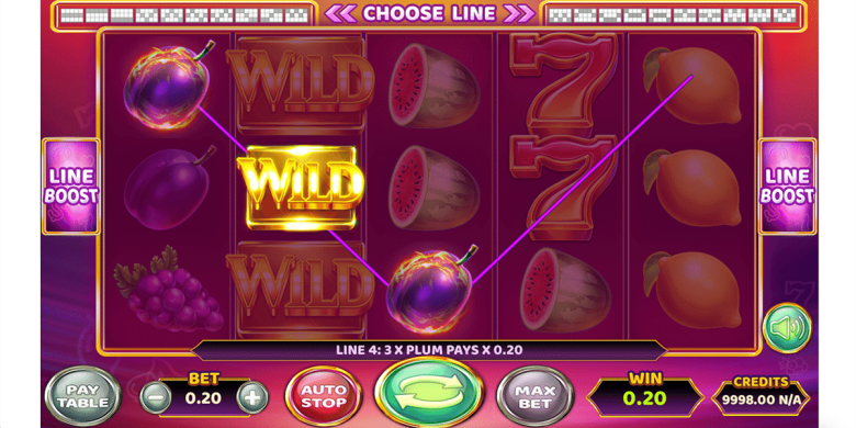 Sobald das Spiel geladen ist, erhält der Spieler eine kurze Zusammenfassung der Bonusfunktionen des Spiels, bevor er die Walzen sieht. Oben erscheint eine visuelle Darstellung der Zahlungszeilen. Sie müssen die Line Boost-Funktion verwenden, wenn ein Spieler sie nutzen möchte. Sie finden links und rechts von der Rolle eine Line Boost-Taste, mit der Sie diese Funktion aktivieren können.