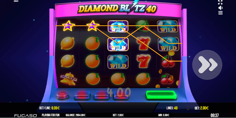 Sie können Diamond Blitz 40 Slot kostenlos mit 5 Walzen in 4 Reihen spielen, die 40 Linien für Gewinnkombinationen bilden. Drei bis fünf übereinstimmende Symbole können auf einer Linie gefunden werden, und die Auszahlung wird dann aus dieser Anzahl berechnet.
